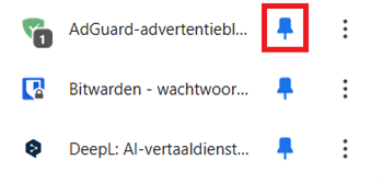 Als je de extensie niet ziet, klik dan met de rechtermuisknop op het puzzelstukje. Klik vervolgens naast de adblocker die je hebt geïnstalleerd op het pinnetje zodat het blauw wordt. De extensie wordt zichtbaar naast de adresbalk.