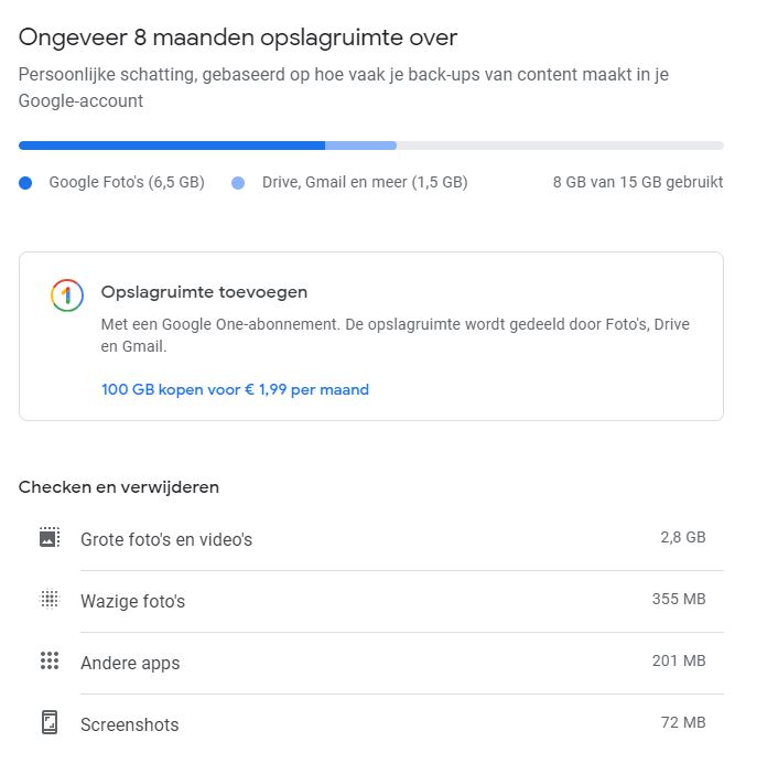 Sinds vandaag, 1 juni 2021 is alles veranderd. Uiteraard heeft Google bevestigd dat foto's die voor deze datum zijn opgeslagen, online blijven (zonder garantie dat dit in de toekomst ook het geval zal zijn). Maar elke foto die je vanaf nu uploadt, telt meer voor de gebruikelijke 15 GB in je Google-account. De enige gebruikers die deels van deze maatregel bespaard blijven, zijn de bezitters van een Google Pixel-smartphone.