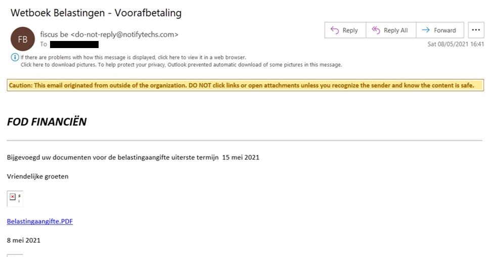 Ook de FOD Financiën komt weer in het vizier van phishers. Wees zeker op je hoede voor e-mails die je aanmanen je belastingaangifte in te vullen via een bijgevoegde link of berichten die je een terugbetaling beloven. Klik nooit op de links of bijlagen en vul géén gegevens in. Om je belastingaangifte online in te vullen, moet je altijd passeren via MyMinfin (Tax-on-web). De FOD Financiën zal je aanslagbiljet enkel via de post of via een bericht in je e-Box (op het MyMinfin-platform) bezorgen.