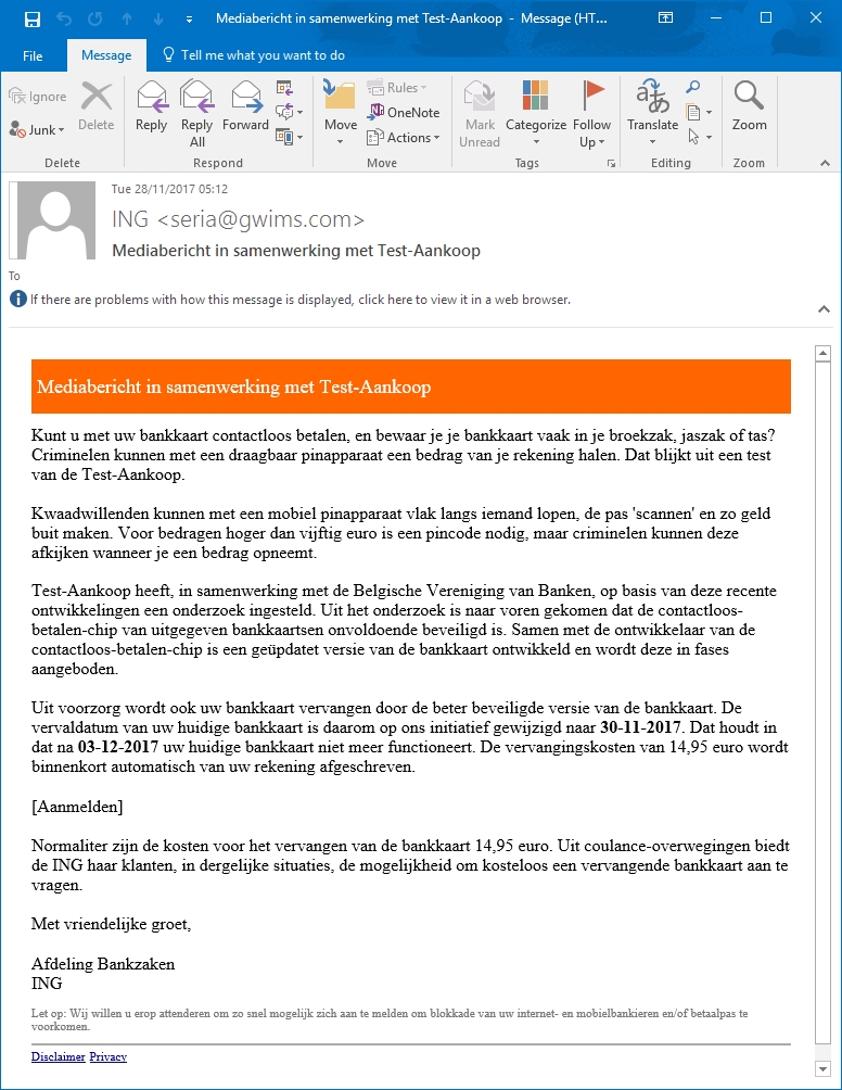 Internetcriminelen hebben die vaststelling uit ons onderzoek aangegrepen om je via een valse e-mail nieuwe, veiligere bankkaarten aan te bieden. Volgens hun valse bericht zou je je bankkaart moeten vervangen, zou je huidige kaart spoedig vervallen en zouden de kosten voor de vervanging € 14,95 bedragen … Allemaal nonsens uiteraard, het enige doel is aan de haal te gaan met je bankgegevens.