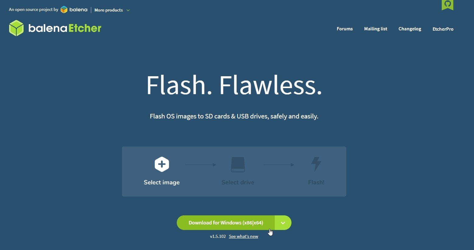 - Surf naar de website van balenaEtcher om het brandprogramma te downloaden