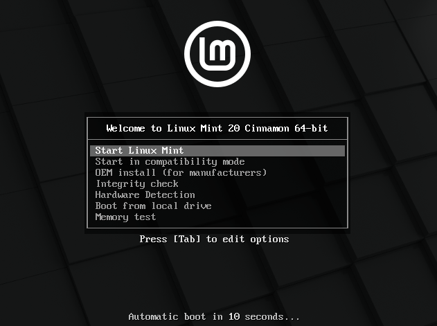 Als dit niet werkt, start de computer dan opnieuw op. Zodra het logo van de fabrikant verschijnt, druk je op de sneltoets die toegang geeft tot het Boot Menu of tot de BIOS/UEFI-instellingen om de opstartvolgorde (Boot Priority) en eventueel andere instellingen (Secure Boot) te wijzigen. - Druk op Enter om de live-sessie in Linux Mint te starten.