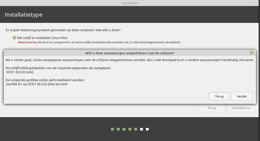 - Vink Wis schijf en installeer Linux Mint aan en klik op Installeer nu.