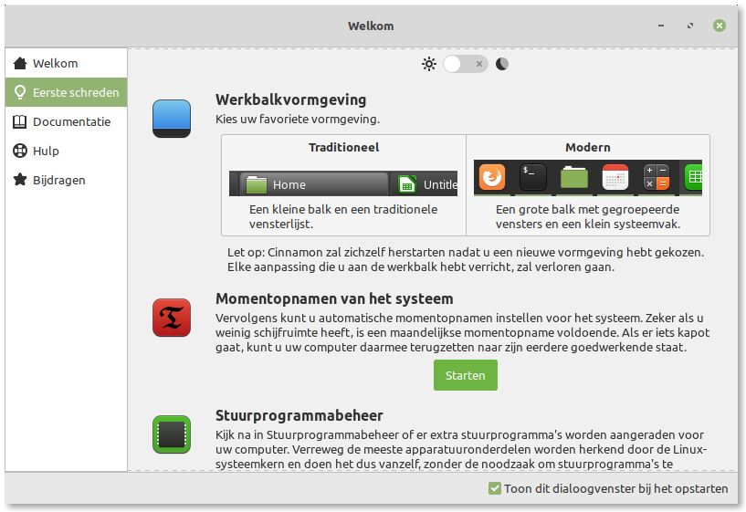 Bij de eerste opstart toont Linux Mint een welkomstscherm vol nuttige uitleg en handige tools. Bekijk in ieder geval de voorgestelde hulpprogramma’s in het tabblad Eerste schreden. Kies voor bijwerken om je besturingssysteem up-to-date en goed beveiligd te houden en installeer de meest recente stuurprogramma’s (drivers). Activeer ook de back-up-tool Timeshift en de firewall. Voorts kun je in dit menu snel je bureaublad ordenen en Linux naar wens configureren (wallpaper, lettertypes enz.).