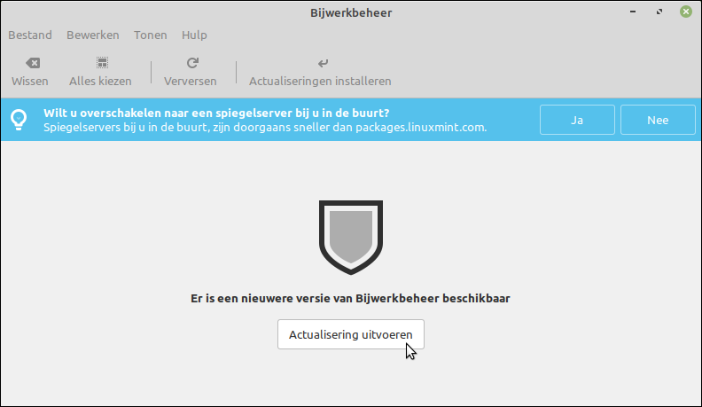 Rechtsonder in de werkbalk geeft een schild-pictogram aan wanneer er een update beschikbaar is. Die kun je dan installeren wanneer je wilt.