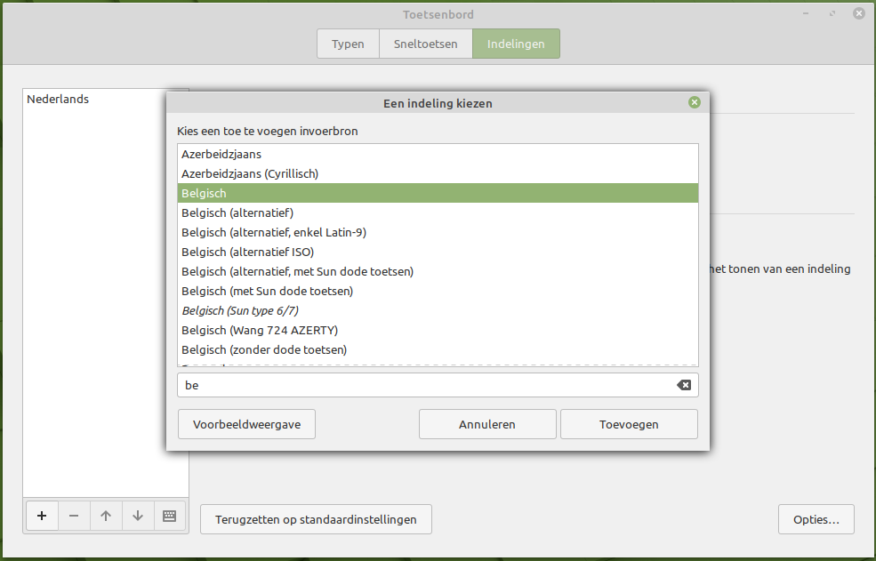 Mogelijk komt de toetsenbordindeling die je bij de installatie hebt gekozen, niet overeen met je toetsen. Om deze te wijzigen, klik je op Menu en typ je "toetsenbord" in het zoekveld. In het venster dat hierna opengaat, klik je op Indelingen > + > Belgisch > Toevoegen. Selecteer de gewenste indeling door op de vlag rechts in de werkbalk te klikken. Maar let op als je wachtwoord speciale tekens bevat.