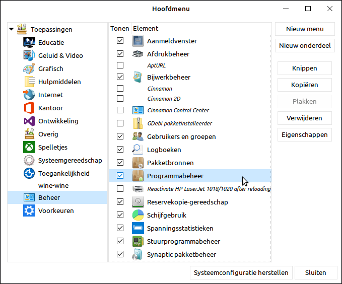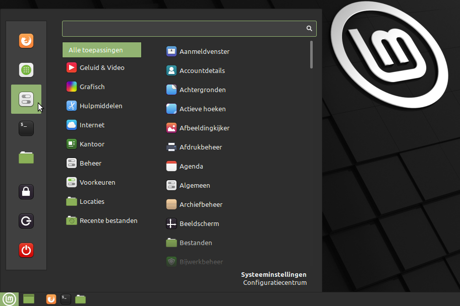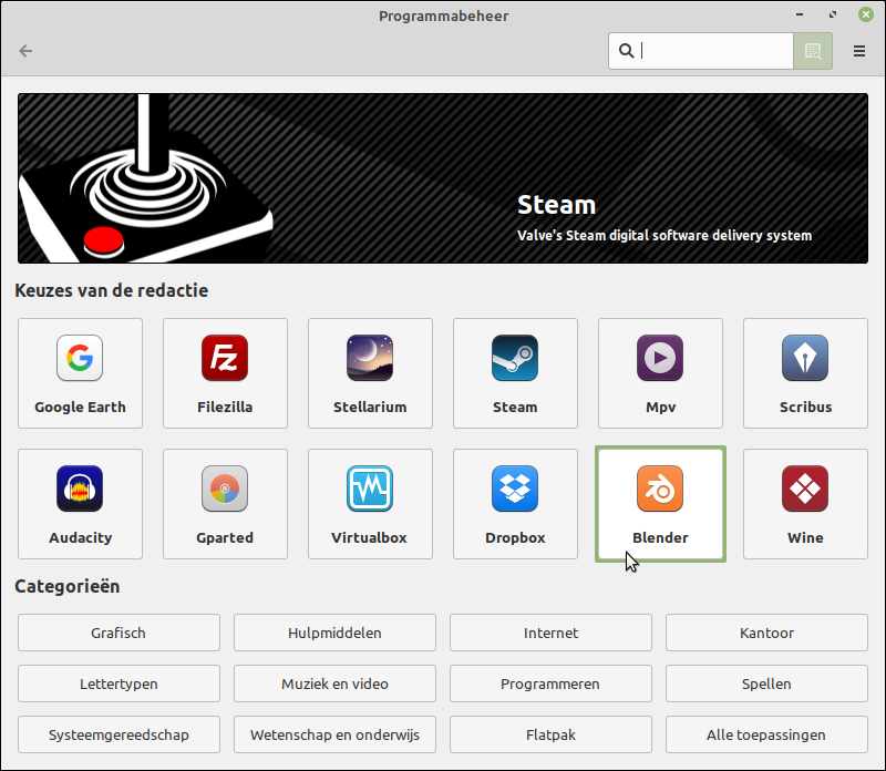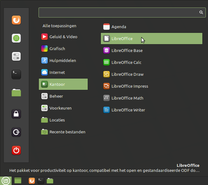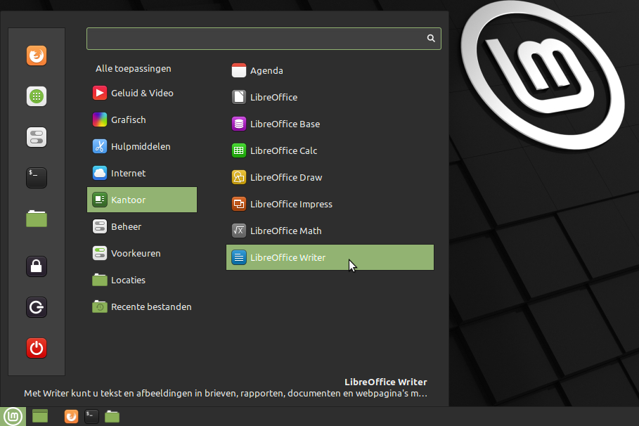 Linux Mint bevat standaard een aantal handige programma’s voor de basistoepassingen. Die staan per categorie gerangschikt in het menu. Hier vind je alles wat je nodig hebt om aan de slag te gaan: het vrije officepakket LibreOffice, de webbrowser Firefox, het e-mailprogramma Thunderbird, een audio- en videospeler enz. Klik op het icoontje van het gewenste programma om het te openen. Of klik erop met de rechtermuisknop voor meer opties, zoals een snelkoppeling op het bureaublad toevoegen of verwijderen.