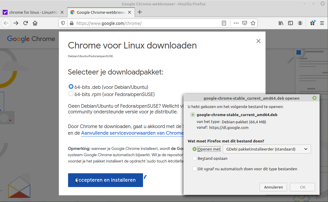 Vind je een programma hier niet terug? Dan kun je misschien rechtstreeks op de officiële website van de uitgever een compatibel pakket downloaden. Zo is de webbrowser Chrome op de website van Google beschikbaar als .deb-bestand. Standaard stelt Linux Mint voor om het te openen met een geschikte pakketinstalleerder, die het programma automatisch installeert en een snelkoppeling plaatst in Menu > Internet > Google Chrome.