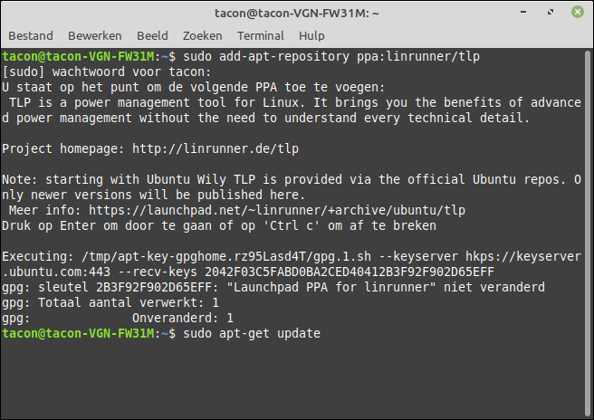 te klikken of Alt + Ctrl + T in te drukken - Kopieer en plak het commando sudo add-apt-repository ppa:linrunner/tlp in het venster en druk op Enter