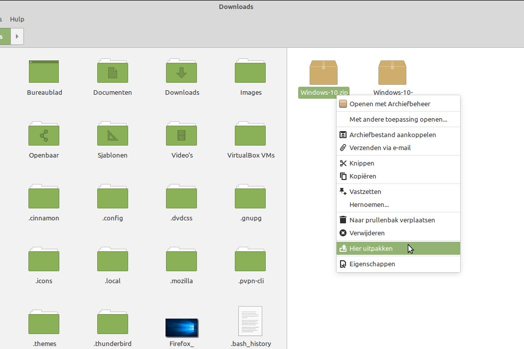 - Plaats de cursor in het paneel rechts op de map Windows-10.zip, klik erop met de rechtermuisknop en klik vervolgens op Hier uitpakken.