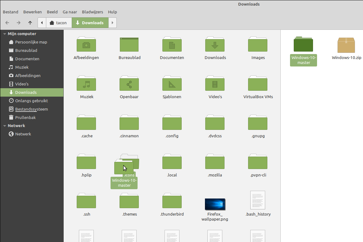 - Herhaal stap 6 en 7 om het bestand Windows-10-master.zip uit te pakken en het uitgepakte bestand Windows-10-master in de map .icons te plaatsen.
