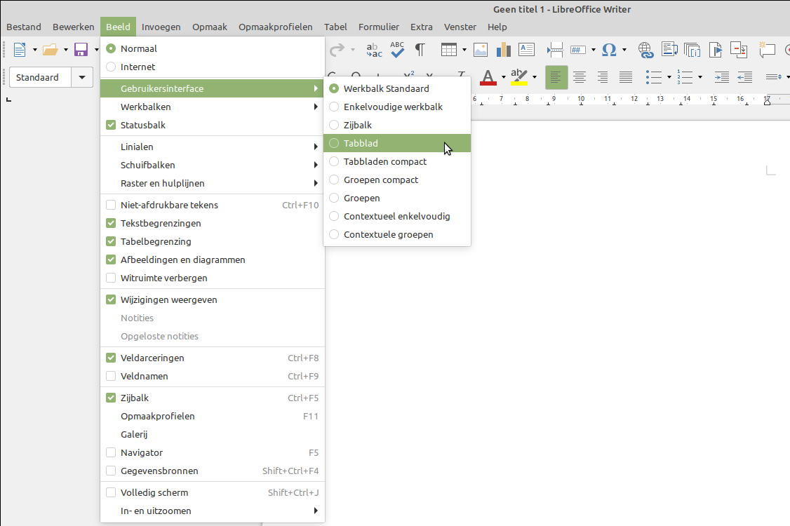 - Onder Beeld > Gebruikersinterface kies je Tabblad.