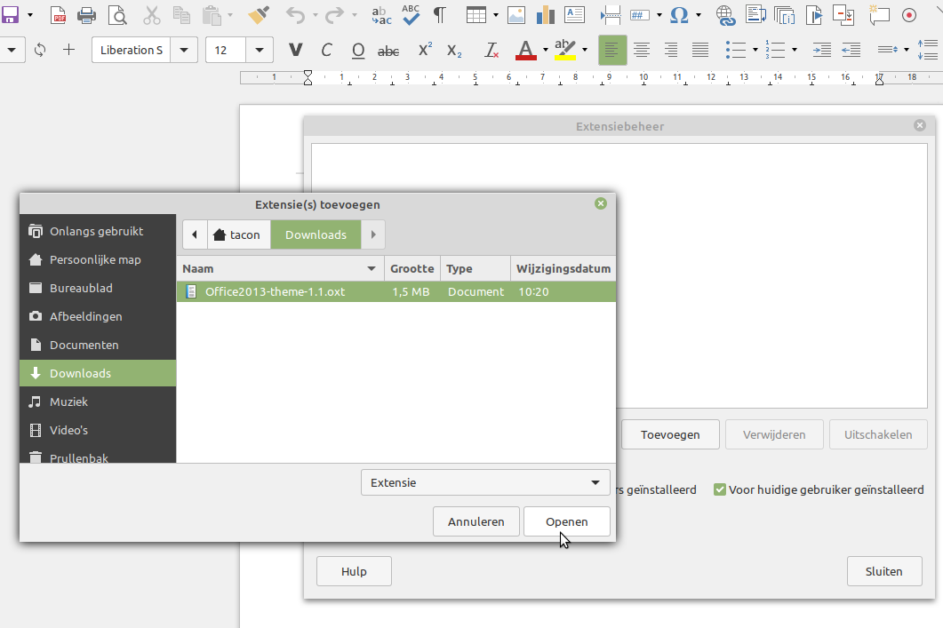 - Klik op Toevoegen, blader door Downloads, selecteer het bestand Office2013-theme-1.1.oxt en klik op Openen.