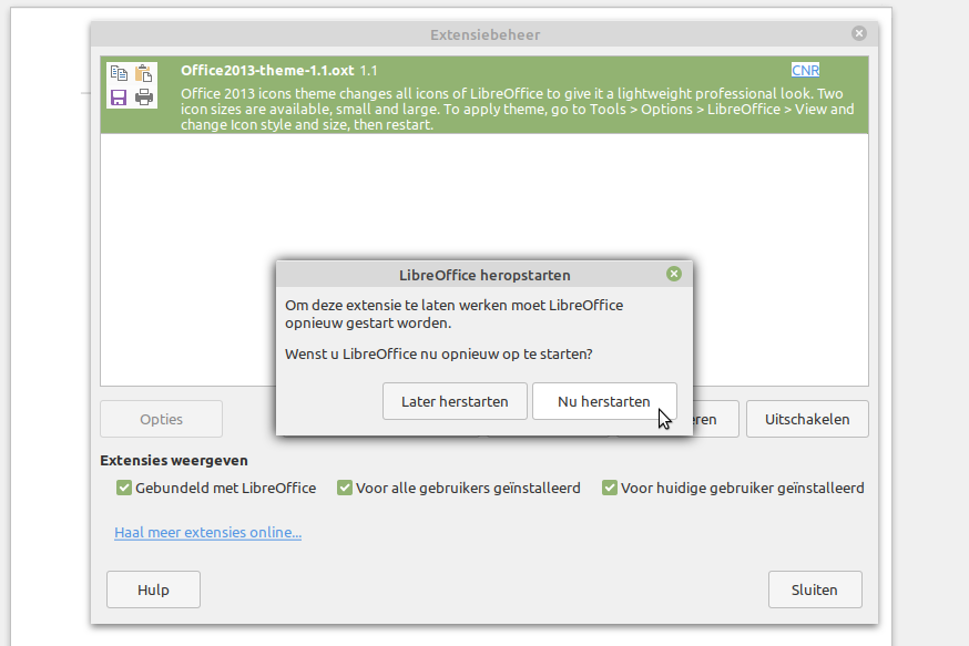- Sluit Extensiebeheer met de knop Sluiten en kies Nu herstarten.