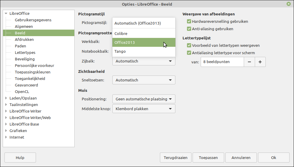 - Klik op Beeld in de linkerkolom en kies dan Office 2013 als Pictogramstijl en klik op Toepassen.