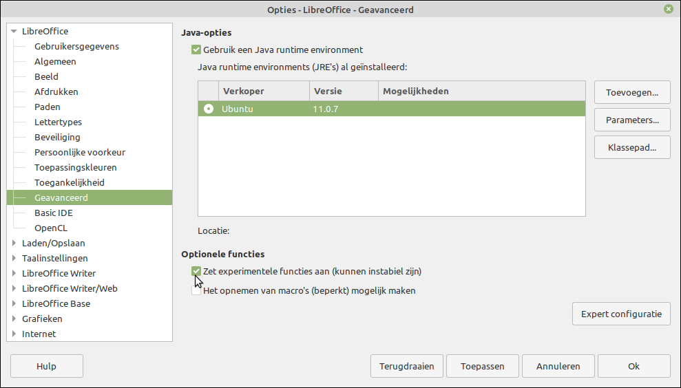 - Onder Geavanceerd zet je een vinkje bij Zet experimentele functies aan en klik je op Toepassen en Nu herstarten.