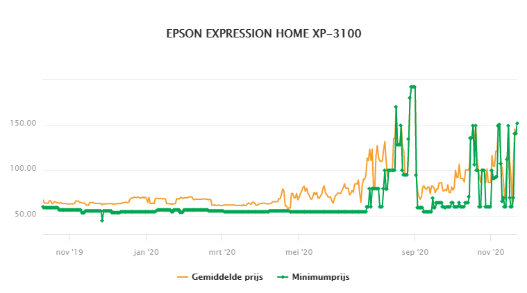 Die € 59 is zelfs niet de laagste prijs ooit voor deze printer van Epson, zoals je kunt zien op de grafiek die de prijsevolutie van de EPSON EXPRESSION HOME XP-3100 weergeeft in onze koopwijzer.