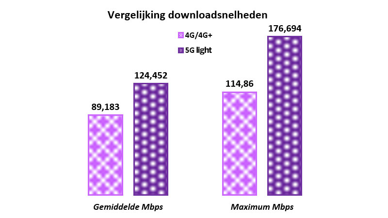 De gemiddelde downloadsnelheid gemeten tijdens de 5G-testen was 124,452 Mbps, terwijl die bij de 4G/4G+ referentietesten 89,183 Mbps bedroeg. Een toename van 39,5 %. De maximale downloadsnelheid die we hebben gemeten met het 5G light-netwerk bedroeg 176,694 Mbps. Met het 4G+4G+ netwerk was die 114,86 Mbps, een verschil van bijna 54 %.