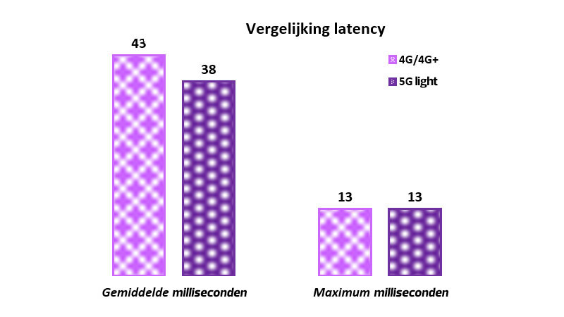 De “latency” – de tijd om data te verzenden en terug te ontvangen, uitgedrukt in milliseconde – was gemiddeld bijna 12 % beter op het 5G-light-netwerk, op de maximumwaarden konden we geen verschil vaststellen. Die bedroeg op beide netwerken 13 milliseconden.
