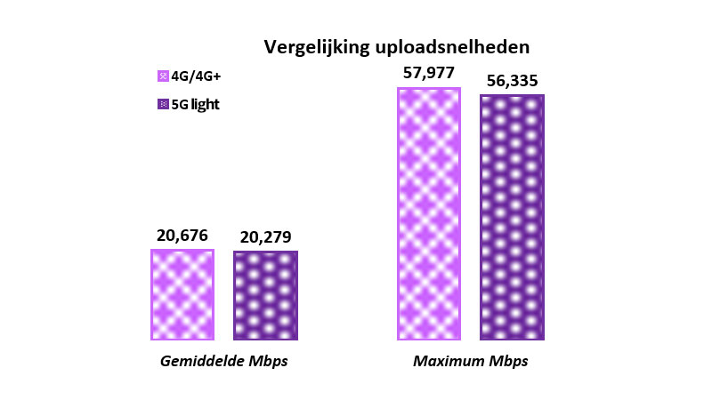 Bij de uploadsnelheid merkten we geen verschil tussen 5G light en het 4G/4G+. Deze snelheden waren gemiddeld en maximaal zelf iets hoger op 4G/4G+ dan op het 5G light-netwerk.