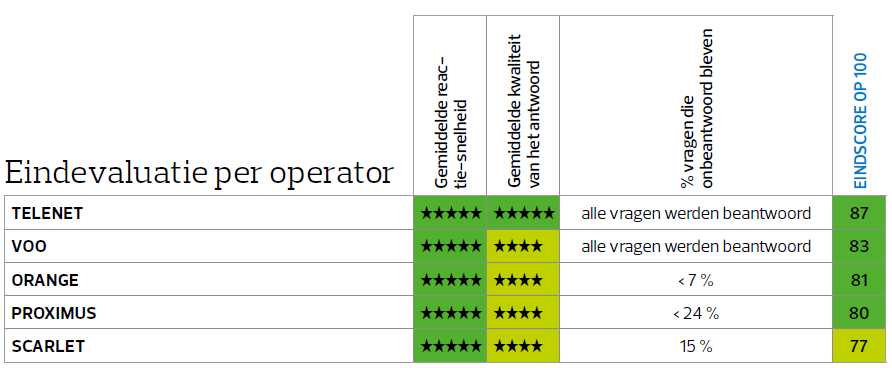 De meeste operatoren beantwoorden de vragen gemiddeld goed. Zo kregen Orange, Proximus, Scarlet en VOO allemaal de op één na hoogste score voor de antwoorden die ze onze panelleden stuurden. Telenet kenden we de hoogste score toe omdat zij voor één op de drie antwoorden steeds de maximumscore behaalden. Bij VOO, Orange, Proximus en Scarlet werd die maximumscore minder vaak behaald. Het overzicht van onze eindevaluatie vind je hieronder terug.