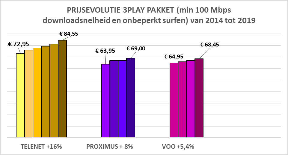 Zo’n jaarlijkse prijsstijging gebeurt trouwens niet alleen bij Telenet. Ook klanten van de andere grote telecomoperatoren VOO en Proximus worden hiermee sinds de voorbije jaren geconfronteerd, zoals je kunt zien in onderstaande grafiek.