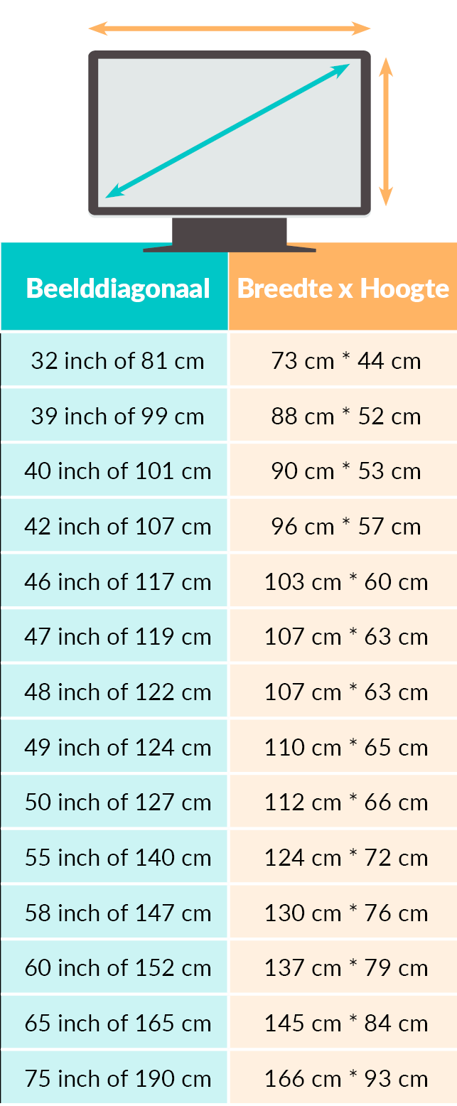De grootte van een tv wordt gewoonlijk uitgedrukt in inch, maar dat is louter de beelddiagonaal. Als je over een beperkt oppervlak voor de tv beschikt, is het echter belangrijk dat je ook de hoogte en de breedte kent.