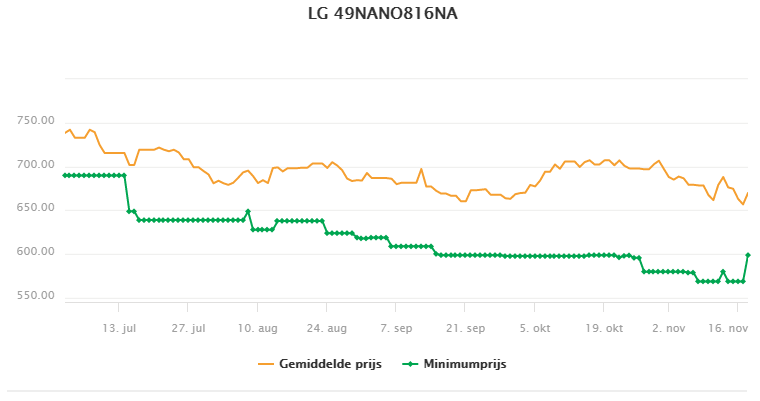 Opmerkelijk is wel dat Exellent de prijs van €799 nooit echt heeft gebruikt. In september betaalde je € 649 voor deze LG-tv, in oktober lag de prijs dan weer op € 749 om nadien, vanaf 1 november, te zakken naar € 699. Er wordt wel bij vermeld dat het de adviesprijs is, maar daarmee wordt deze promotie toch wat “opgeblazen”. Hieronder zie je hoe de prijs de voorbije maanden evolueerde.