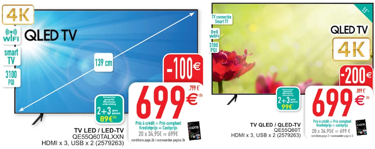 Cora biedt deze tv aan voor een promotieprijs van € 699. Opmerkelijk is dat Cora Anderlecht deze prijs vermeldt in twee verschillende brochures, die dezelfde geldigheidsdatum hebben maar een verschillende korting: € 100 (op € 799) en € 200 (op € 899).