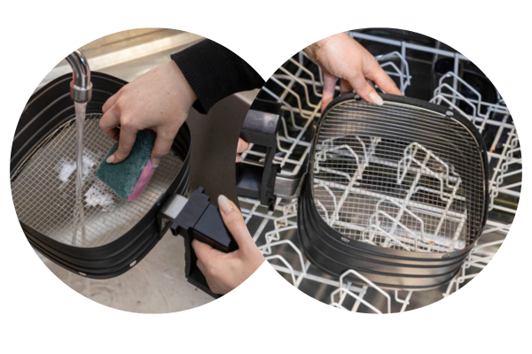 Meestal kun je bij een airfryer het mandje gerust in de vaatwasser doen. Aangekoekte etensresten? Zorg er dan wel eerst voor dat je het mandje 10 minuten laat weken in warm water met een beetje afwasmiddel. Vervolgens kun je de etensresten met een zachte spons of schotelvod verwijderen. Daarna hoef je het mandje alleen nog maar met de hand af te wassen of in de vaatwasser te plaatsen.