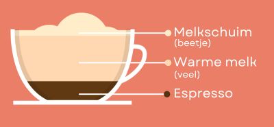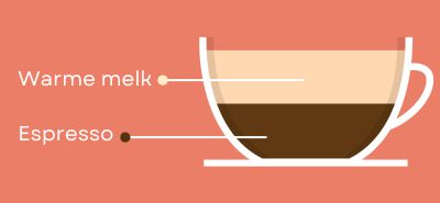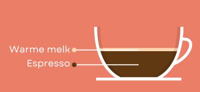 Dit is een milde koffie. Je maakt een goede hoeveelheid melkschuim, afhankelijk van de grootte van je kop of beker. Je vult de beker tot ongeveer een centimeter onder de rand, en voegt dan een espresso toe. De verschillende delen gaan zich mengen en er ontstaan mooie laagjes.
