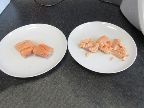Om de functie vacuümgaren te testen, lieten we twee zalmfilets 30 minuten lang op 52 °C garen. Zonder voorverwarmen was de zalm nog rauw, niet echt om blij van te worden. Met voorverwarmen was de zalm na 36 en een halve minuut wel mooi gegaard.