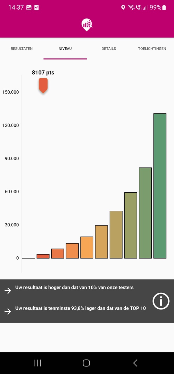 Op basis van de resultaten van deze 5 testen wordt een eindscore in punten bepaald. Deze kan vervolgens worden vergeleken met andere resultaten voor dezelfde locatie.