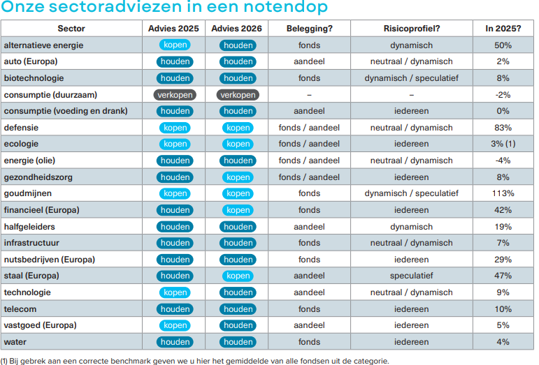 Niet elke sector is even interessant en onze adviezen staan ook niet in steen gebeiteld. Van tel is het toekomstperspectief. In de tabel hieronder kun je ons sectoradvies zien begin 2025 en begin 2026. Zo trekken we opnieuw de kaart van gezondheidszorg, financieel en staal en laten we het brede koopadvies rond alternatieve energie, technologie en vastgoed varen. In totaal vinden we zes sectoren globaal gezien interessant.