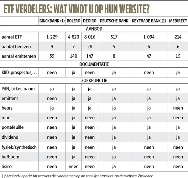 We bekijken het aanbod en de informatie over ETF’s bij de zes instellingen die wél de moeite doen om u een deftig aanbod trackers voor te schotelen en waarvan we weten dat heel wat lezers er klant zijn: BinckBank, Bolero, DeGiro, Deutsche Bank, Keytrade Bank en MeDirect.