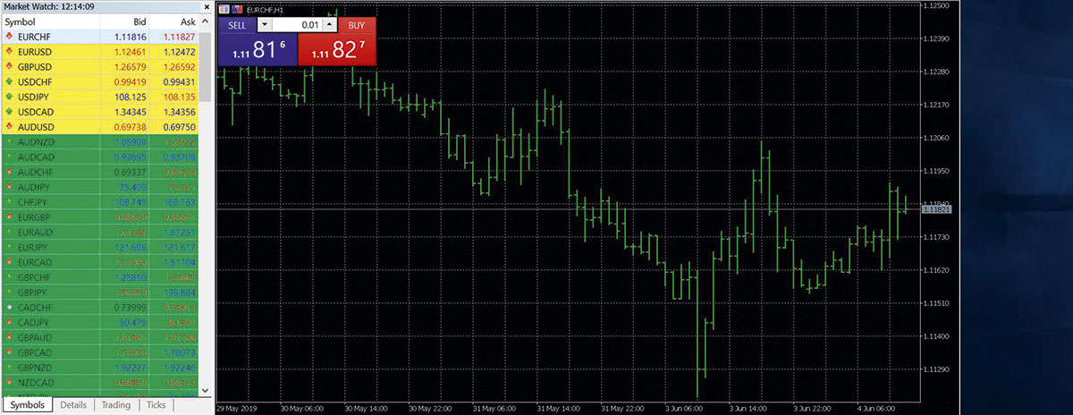 De meest simpele manier is om uw handelsplatform te openen en zelf te gaan traden. Dat ziet er vervolgens als volgt uit. Links ziet u de lijst van (een deel van) de mogelijkheden waarin u kunt gaan handelen, rechts ziet u de grafiek van de munt. In dit geval EURCHF. Zoals u kunt zien, zult u 1,11827 Zwitserse frank betalen per euro of zult u 1,11816 Zwitserse frank krijgen per euro als u verkoopt.