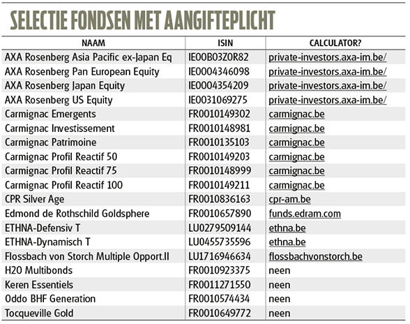 Gelukkig bieden heel wat fondsenbeheerders u de informatie op een schoteltje op hun Belgische website. Dat doen ze aan de had van een belastingcalculator die u kunt vinden door (gratis) in te loggen op hun website, al dan niet als particuliere belegger. In de tabel ziet u de websites terug waar zo’n calculator te vinden is. Dat is het geval voor de fondsen van Carmignac Gestion, CPR Asset Management, Edmond de Roth-schild Asset Management, ETHENEA en Flossbach von Storch. In de calculator vult u in hoeveel stukken van het fonds u hebt en uw eventuele transacties in dat fonds in 2019. Vervolgens spuit de calculator de cijfers uit die u moet invullen in uw aangifte.