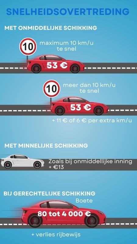 - Overschrijding van de maximumsnelheid met meer dan 10 km/u: €11 voor elke extra km/u binnen de bebouwde kom of in een 30 km/u-zone (buiten de bebouwde kom is de boete €6 voor elke extra km/u).