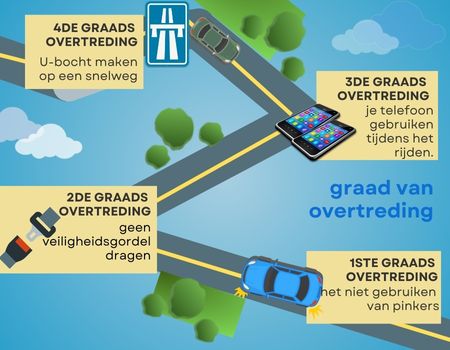 - 1ste graads overtredingen: Overblijvende overtredingen, minder ernstig dan de vorige. Voorbeeld: het niet gebruiken van richtingaanwijzers, enz.