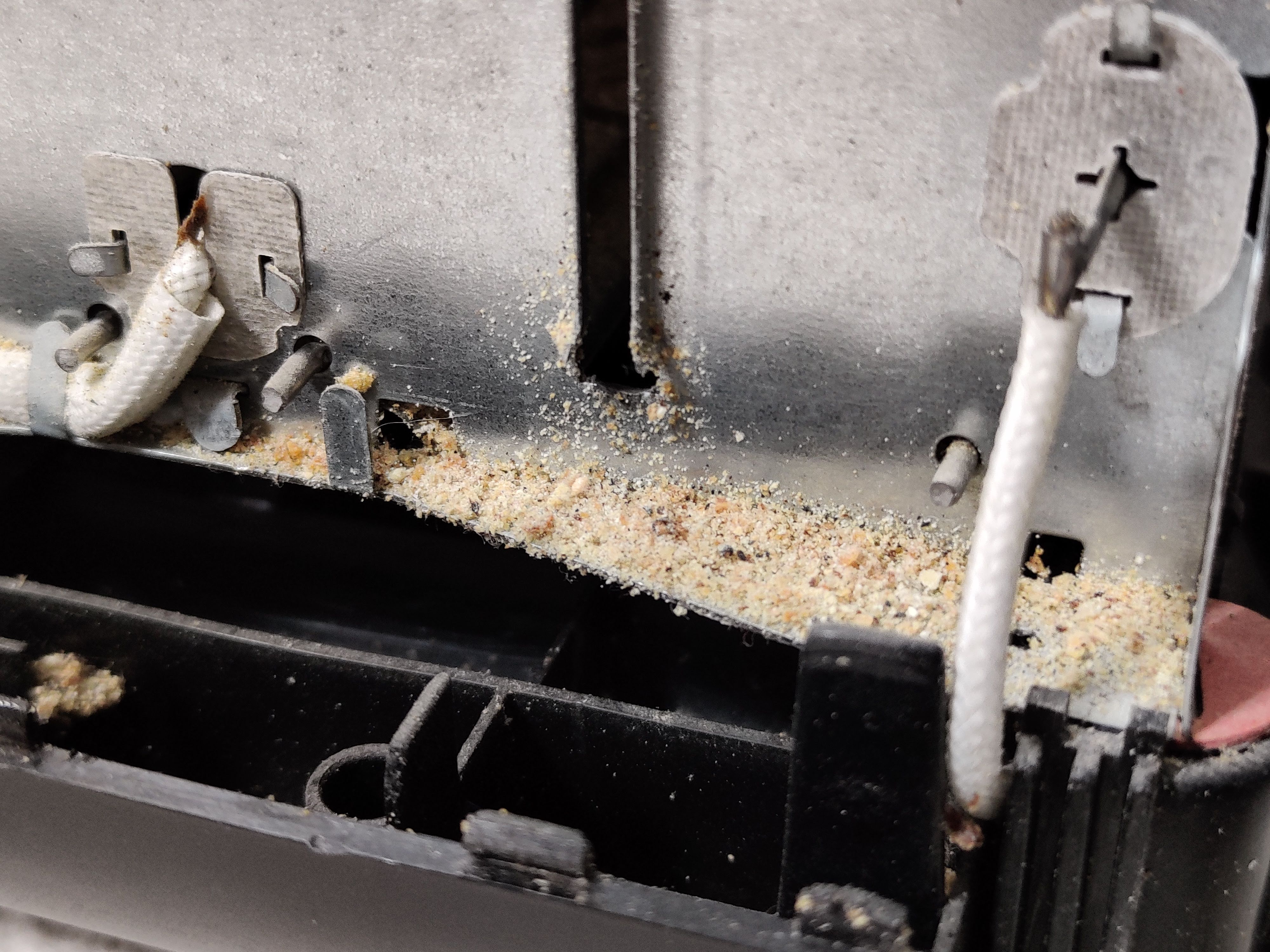 Na enige tijd, en ook afhankelijk van het gebruikte soort brood, kunnen zich broodkruimels in de broodrooster ophopen. Als er ook kruimels worden neergelegd tussen de metalen plaat die de hendel omlaag houdt en de elektromagneet terechtkomen, is de aantrekkingskracht niet langer voldoende.