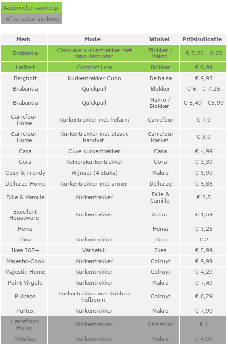 Een goede kurkentrekker ligt goed in de hand en laat u een fles openen zonder al te veel spierkracht te moeten inschakelen en zonder daarbij de kurk kapot te trekken. Slechts twee van de 23 geteste modellen konden onze lezers overtuigen. Het merendeel van de kurkentrekkers kwam in de middenmoot terecht: noch goed, noch echt slecht. De modellen van Metaltex en Carrefour Home werden ten slotte door het voltallige testpanel afgeraden.