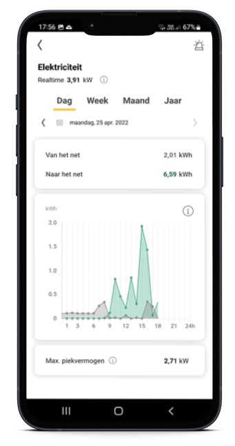 Je kunt zien hoeveel stroom je van het net afneemt en hoeveel stroom die jouw zonnepanelen produceren, naar het net gaat.