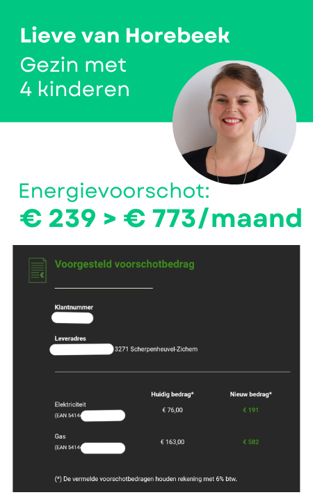 Het gezin van Lieve is een nieuw samengesteld gezin met 2 pubers, een kleuter van 3,5 jaar en een baby van 8,5 maand. Hun voorschotfactuur ging van 239 euro naar 773 euro.