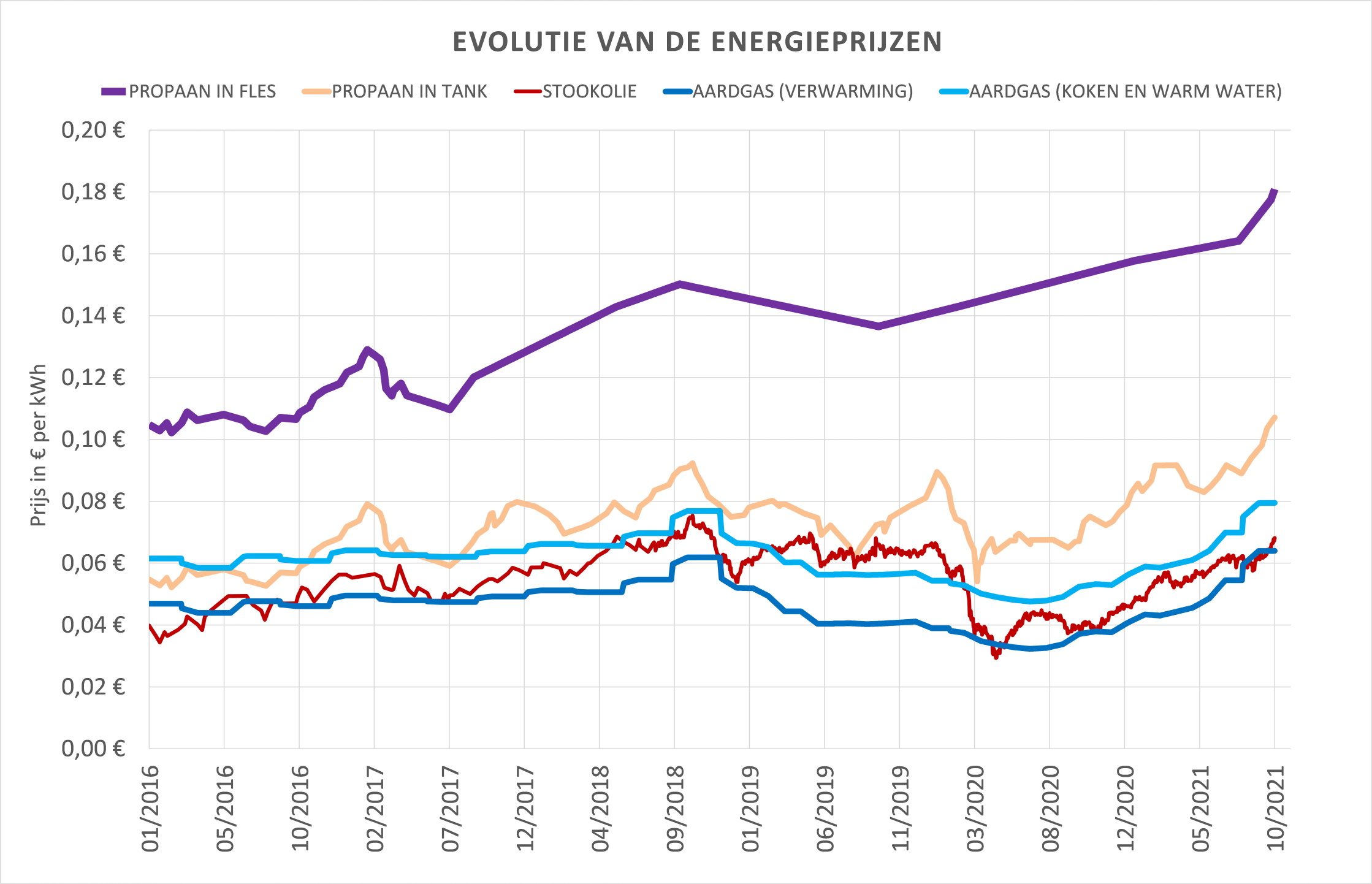De flessen propaan en butaan ontsnappen niet aan de stijgende prijzentrend. Dit is des te kwalijker omdat de prijs structureel hoger ligt dan die prijs van andere brandstoffen.. Intussen is gas uit flessen gemiddeld al 2,5 keer zo duur als aardgas. De prijs van propaangas in flessen draait momenteel immers rond 18 eurocent per kWh, tegenover zo’n 7 eurocent voor aardgas. Weet overigens dat je iets minder betaalt als je een groot verbruik hebt wanneer het aardgas ook voor de verwarming wordt gebruikt dan wanneer je het aardgas enkel gebruikt om te koken en om warm water aan te maken.