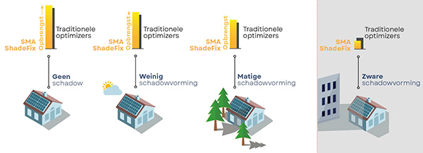 Op een mooi dak met een optimale oriëntatie, met een beetje schaduw van takken of schoorstenen, zou ik nooit optimizers overwegen, maar kiezen voor een omvormer met een schaduwbeheersysteem zoals het 'Shadefix'-systeem van bijvoorbeeld SMA.