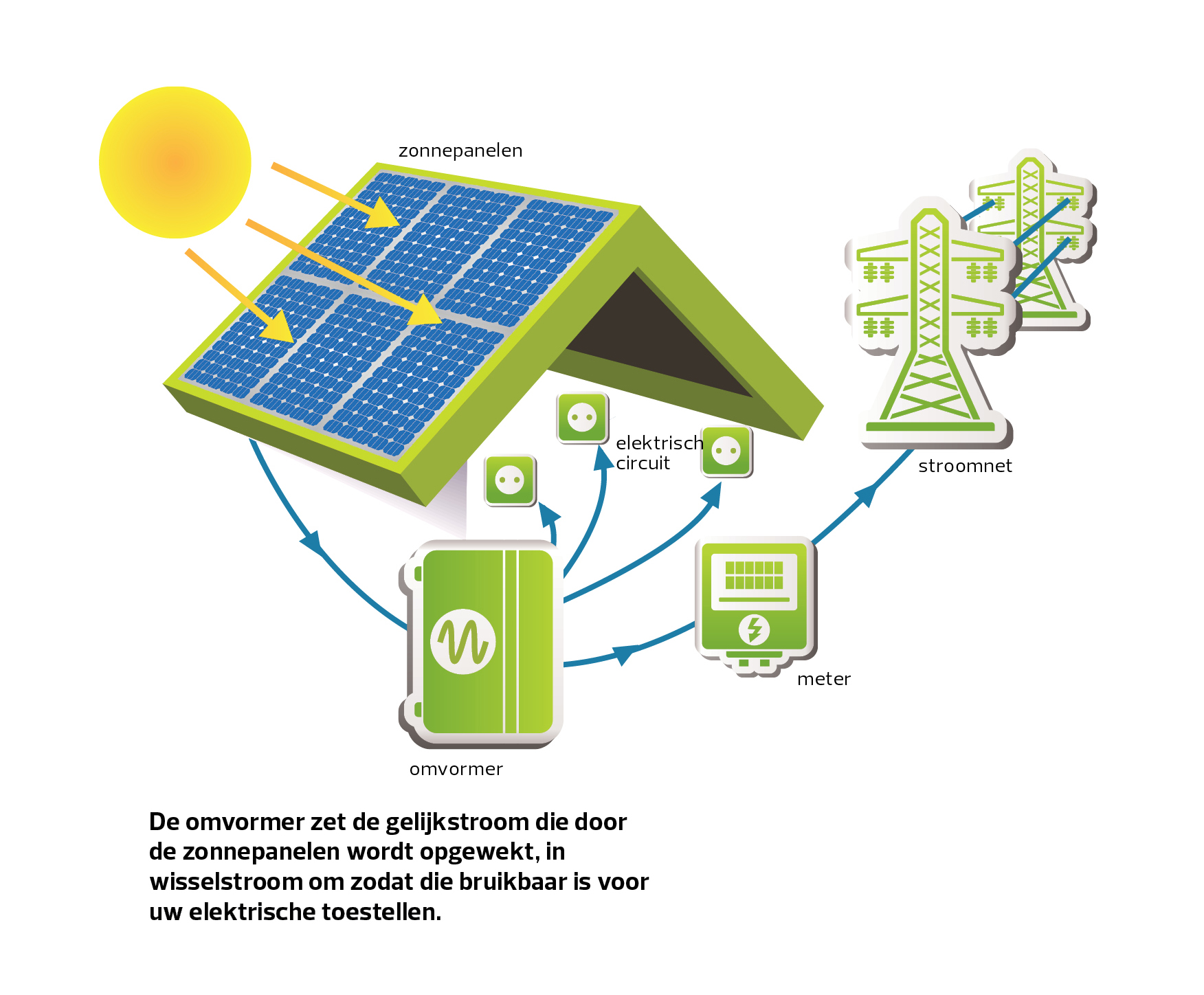 De omvormer van de fotovoltaïsche installatie zorgt ervoor dat de gelijkstroom die wordt opgewekt door zonnepanelen, wordt omgezet in wisselstroom die kan worden benut door het stroomnet en zo door de elektrische huishoudtoestellen in huis.