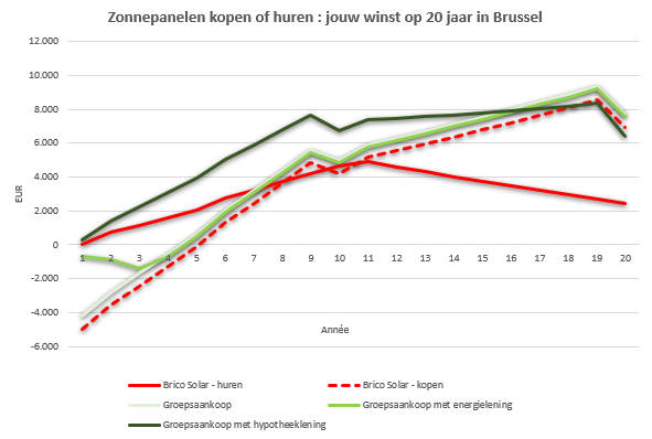 In het aanbod van Brico Solar betaal je voor de huur van eenzelfde installatie over een termijn van 20 jaar in totaal € 3 600 per kWp. Dat is 2,5 keer de prijs van de koopformule!
