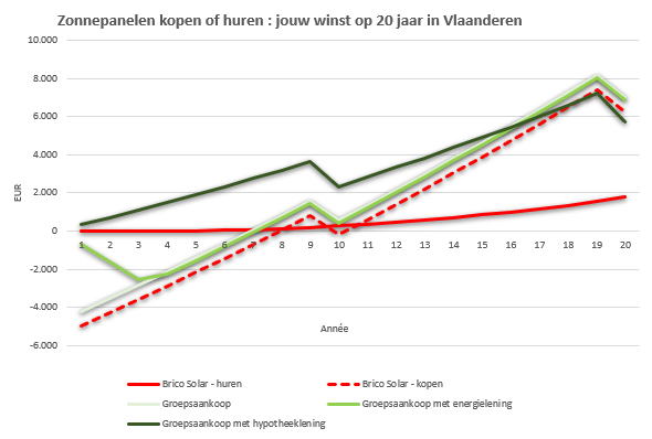 De resultaten liegen er niet om. Met de huurformule zul je op 20 jaar een winst van ongeveer € 1 800 maken. Met de koopformule stijgt je winst tot € 5 700 à € 7 000, zelfs als je de extra uitgaven voor de (dubbele) vervanging van de omvormer meerekent.