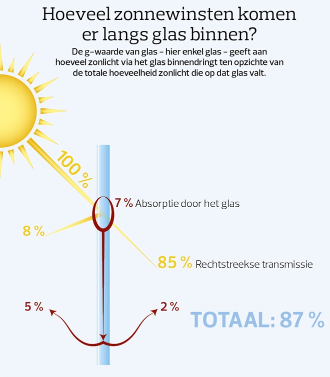 | Hoogrendementsglas laat op zich doorgaans 65 % van alle zonne-energie door. De zonwering perkt dit verder in en zorgt dus voor de bijkomende winst. In technische termen heeft men het over de zontoetredingsfactor of g-waarde. (Bron: WTCB) | ||