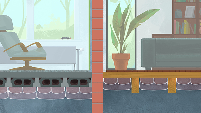 De Rd-waarde is de gedeclareerde warmteweerstand van een materiaal: hoe hoger deze waarde is, hoe beter een materiaal isoleert. De Rc-waarde daarentegen is de warmteweerstand van de volledige constructie. Voor een vloer omvat dit de isolatie, draagconstructie, chape en vloerafwerking.
